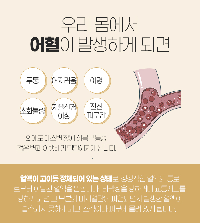 이렇게 어혈이 발생하여 혈액순환 장애가 나타나게 되면 두통과 어지러움, 이명, 소화불량, 자율신경 이상, 전신 피로감, 대소변 장애 등의 증상이 나타나게 된답니다.