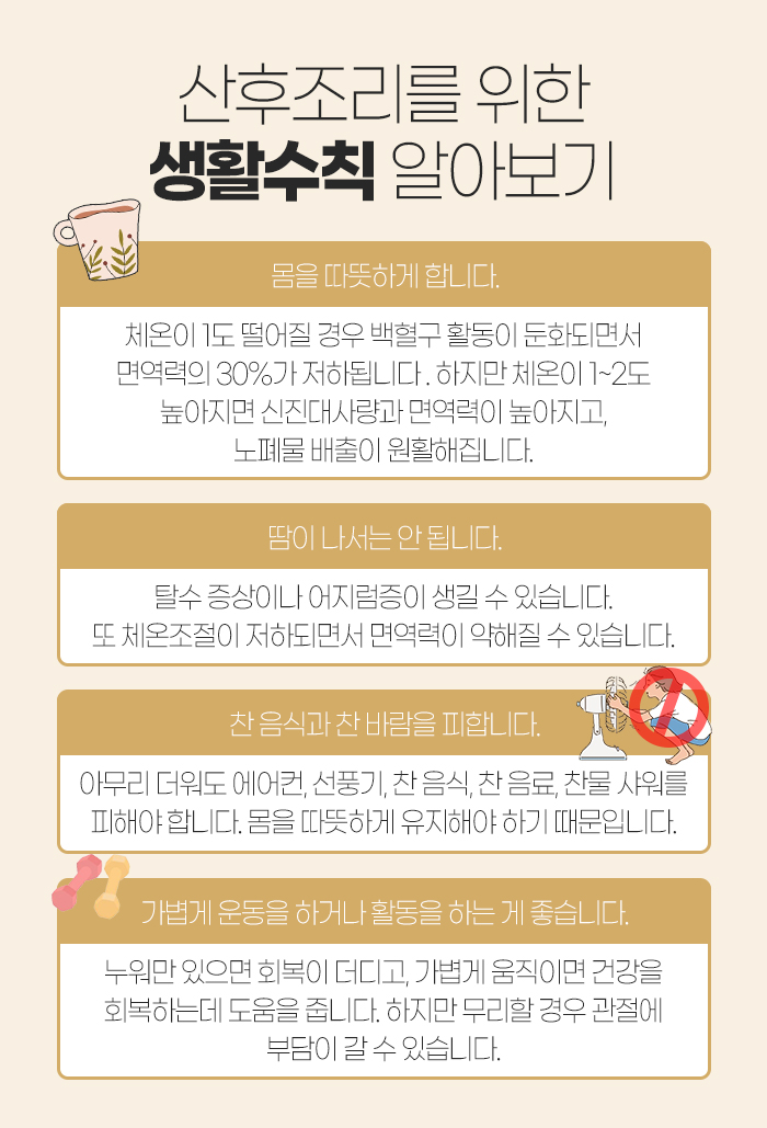 참고로 몸을 따뜻하게 한다고 해서 땀이 나서는 안 되는데요. 땀이 나게 되면 탈수 증상과 어지럼증이 발생할 수 있고 체온 조절이 저하되면서 면역력이 약해질 수 있기 때문입니다. 또 가볍게 운동을 해야 하는 이유는 오히려 누워만 있을 경우 회복이 더디기 때문입니다.