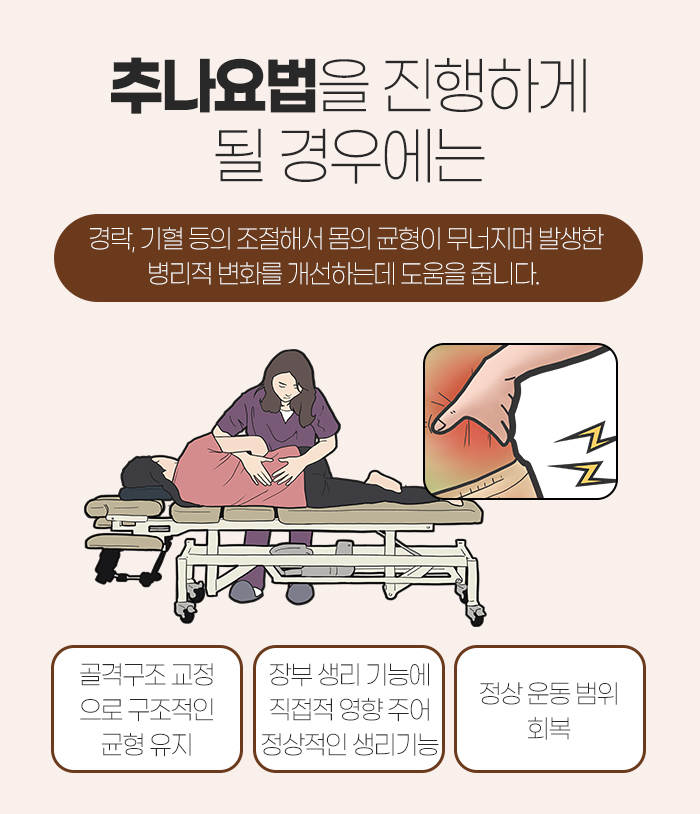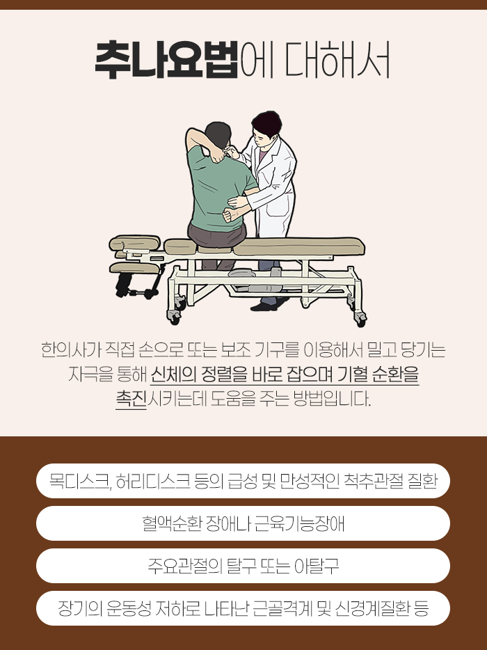 주요 관절의 탈구나 아탈구, 목디스크나 허리디스크 등의 급성 및 만성적인 척추 관절 질환, 혈액순환 장애나 근육기능 장애, 장기의 운동성 저하로 인해 나타난 근골격계 및 신경계 질환 등에도 도움을 줄 수 있는데요.