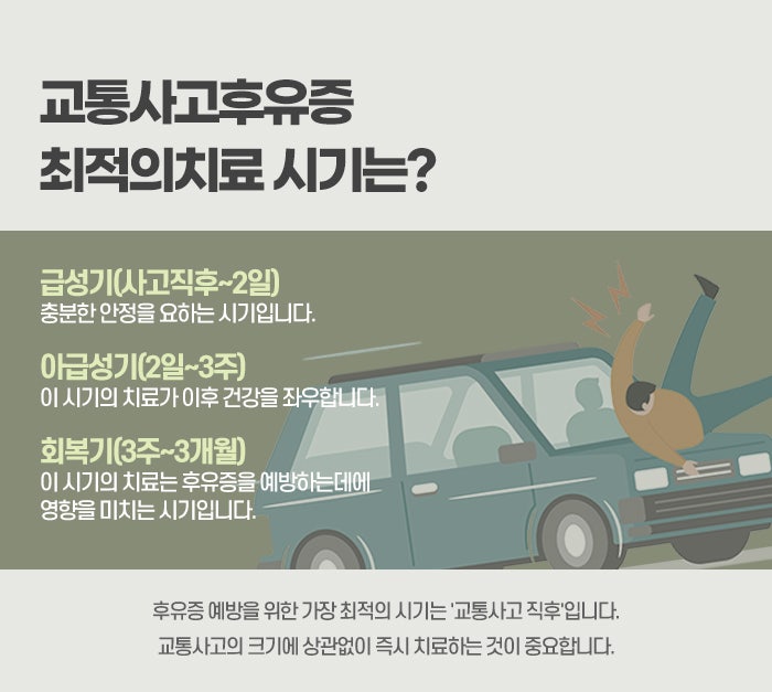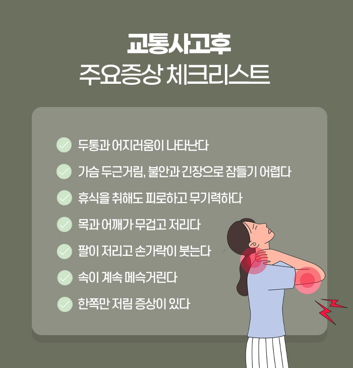 교통사고 후유증은 자동차 충돌 사고 이후 신체에 가해진 물리적인 충격으로 인해 나타나는 각종 통증과 심리적 이상 증세가 사고 직후보다는 시간이 어느 정도 흐른 뒤에 서서히 나타나거나 지속되는 상태를 의미합니다. 사고 당시에는 당황스러운 마음과 긴장감 때문에 아드레날린이 분비되면서 통증을 제대로 느끼지 못하는 경우가 많지만, 짧게는 2~3일에서 길게는 수주가 지난 후에야 몸 이곳저곳이 아프기 시작하는 것이 특징입니다. 이러한 후유증이 발생하는 주된 원인은 편타성 손상이라고 불리는 목과 척추의 급격한 흔들림입니다. 차량이 부딪히는 순간 사람의 몸은 관성에 의해 앞뒤로 크게 휘어지는데, 이때 목뼈가 마치 채찍을 휘두르는 것처럼 꺾이면서 주변 근육과 인대에 미세한 손상을 입히게 된다고 원주입원실한의원에서는 말합니다.