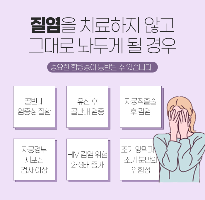 하지만 그럴 경우 중요한 합병증이 동반될 수 있는데요. 골반 내 염증성 질환이 생길 수 있고, 자궁경부 세포진 검사 이상이 나타날 수 있습니다. 또 감염 위험이 증가하게 되는 등의 문제가 나타나는 만큼 가능한 빠른 시일 내에 치료를 하는데 도움을 받는 것이 좋답니다.