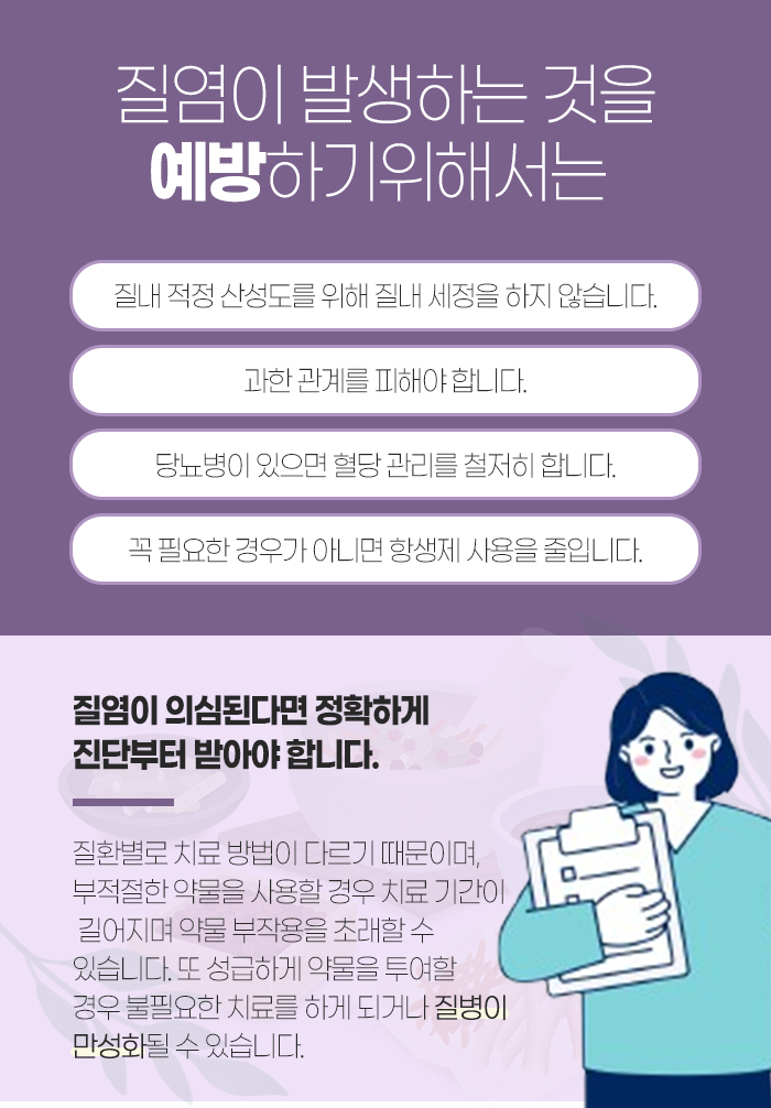 그리고 질염이 나타나는 것을 예방하기 위해서는 내부를 세정하지 않는 것이 좋고, 과한 것을 피해야 하며 꼭 필요한 경우가 아니라면 항생제를 사용하는 것을 줄이도록 해야 합니다. 또 당뇨병이 있다면 혈당 관리를 철저히 해야 하는데요. 이는 당뇨병이 칸디다증의 발병 위험을 높이기 때문입니다.