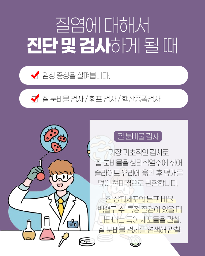 그리고 보통 질염때문에 원주공휴일한의원까지 찾아주시는 경우에는 이미 치료를 받았는데도 나아지지 않은 경우가 많아서라고 말씀을 드렸는데요. 이와 관련해 질염의 진단에 대해 말해보자면 임상 증상을 살피고 분비물 검사와 휘프 검사, 핵산 증폭 검사를 진행하게 된답니다.