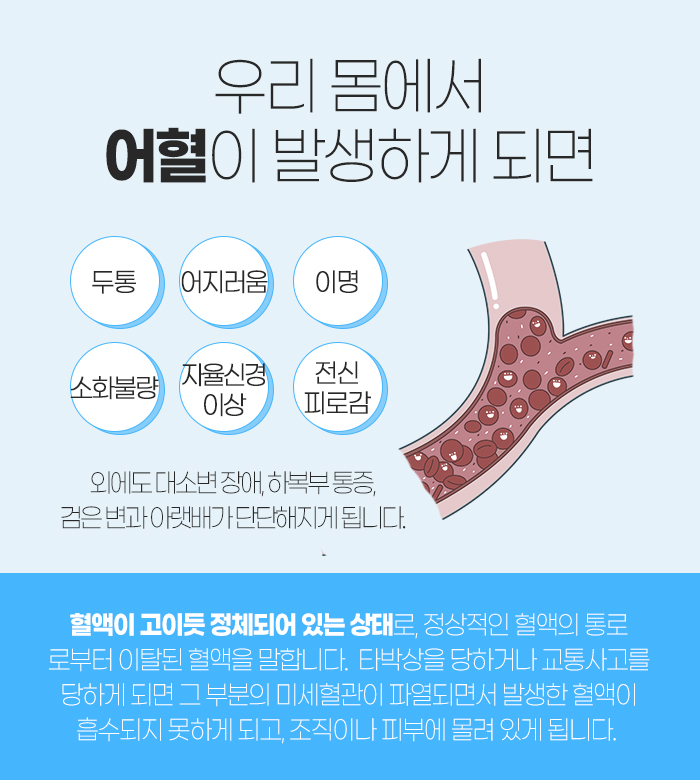 그리고 어혈 역시 신경 쓰도록 해야 하는데요. 어혈은 혈액이 고이듯 정체되어 있는 상태를 말합니다. 몸이 충격을 받게 되면 해당 부분의 미세혈관이 파열되면서 생긴 혈액에 흡수되지 못한 채 조직이나 피부에 몰려 있게 되는데요.