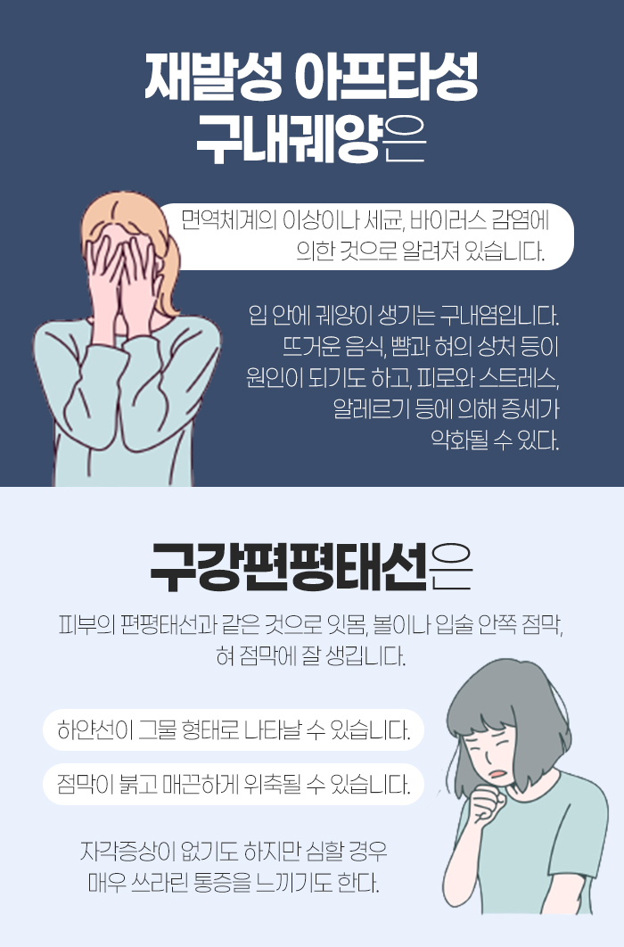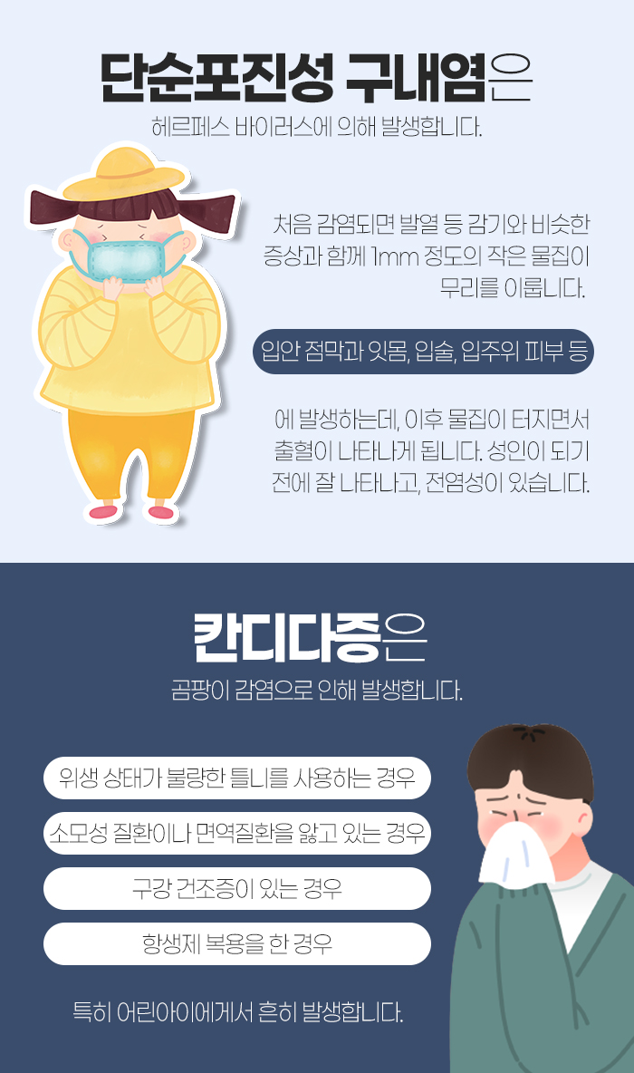 감염성 구내염의 경우 세균 감염, 바이러스 감염이 원인이 되어 나타나게 되는 단순포진, 구강캔디다증 등이 있답니다. 또 비감염성 구내염의 경우 자가면역과 재발성 아프타성 구내궤양, 편평태선, 유천포창, 천포창 등이 있습니다.