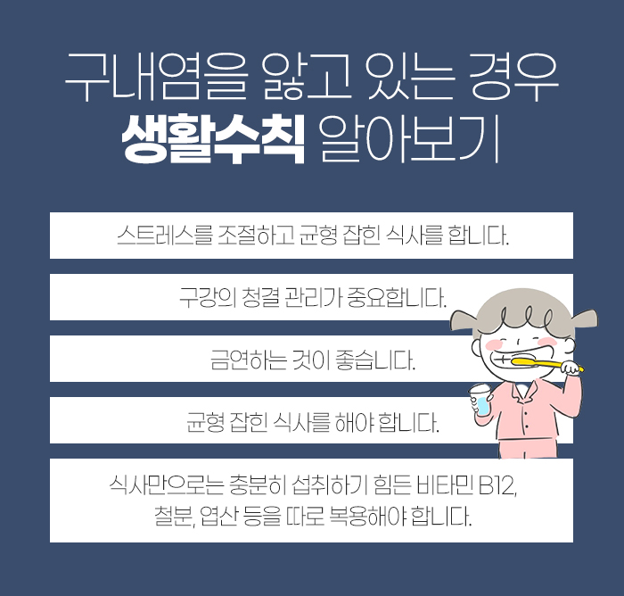 또 스트레스를 조절하면서 균형 잡힌 식사를 해야 하는데요. 스트레스가 건강에 악영향을 끼친다는 사실, 잘 알고 계실 것입니다. 이는 식사 역시 마찬가지인데요. 요즘에는 귀찮거나 바쁘다는 이유로 자주 식사를 거르며 불규칙하게 하시는 경우가 많은데 이런 불규칙함은 몸의 균형 또한 무너트리는 만큼 당연히 건강에 좋지 않습니다. 그래서 구내염 등의 질환이 자주 발생할 수 있답니다. 또 필요한 영양소를 섭취하지 못하다 보니 몸이 약해지는 것은 말할 것도 없습니다.