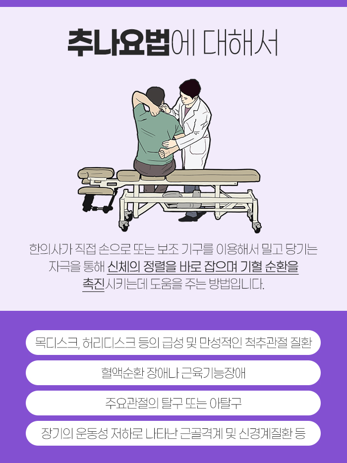 그리고 추나요법은 한의사가 직접 손이나 보조기구로 밀고 당기는 자극을 통해 신체의 정렬을 바로잡으면서 기혈 순환을 촉진시키는데 도움을 주는 방법인데요. 그래서 다음과 같은 증상이 나타나는 경우 무실동일요일한의원으로 내원하셔서 추나요법을 통해 도움을 받고자 하시는 경우가 많답니다.