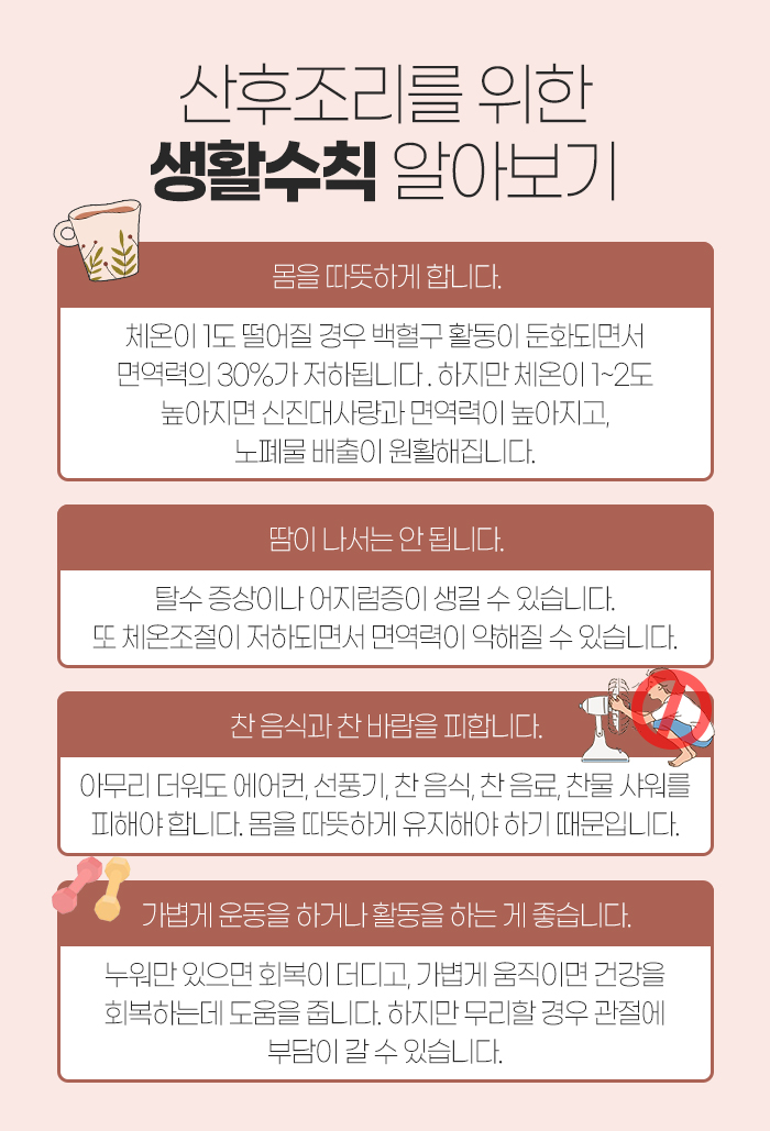또 출산 후 원주주말진료한의원에서 치료를 하는데 도움을 받는 것도 좋지만 다음과 같은 생활 수칙을 꼭 지켜주시도록 해야 한답니다. 몸을 따뜻하게 해야 하고 땀이 나면 안 됩니다. 또 찬 바람과 찬 음식을 피해야 하며, 가볍게 운동을 하거나 활동하도록 해야 합니다.
