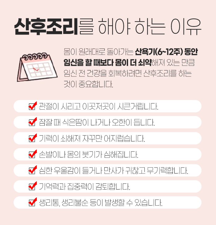 그래서 산후조리를 해야 하는 이유에 대해 자세히 말해보자면 몸이 원래대로 돌아가는 기간을 산욕기라 한답니다. 6주에서 12주 동안을 말하는데, 산욕기 동안은 임신을 할 때보다 몸이 더 쇠약해져 있어서 몸조리를 하는 것이 무척 중요합니다.