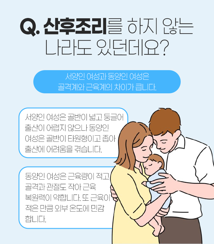 또 산후관리를 하지 않는 나라가 있다 보니 무실동일요일한의원으로 이에 대해 문의 주시는 경우도 있는데요. 이렇게 산후관리를 하지 않는 나라에는 미국에 있는데, 참고로 서양인 여성과 동양인 여성은 골격계와 근육계의 차이가 크다는 점을 명심하셔야 합니다.