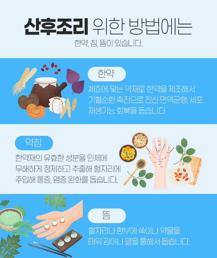 그리고 무실동일요일한의원에서 산후관리에 도움을 드리게 될 때 한약과 약침, 뜸 등의 여러 가지 방법을 진행하게 되는데요. 한약은 체질에 맞는 약재로 제조해서 기혈 순환을 촉진시키는데 도움을 준답니다. 그래서 전신의 면역 균형과 세포 재생 기능을 회복하는데 도움받을 수 있습니다.