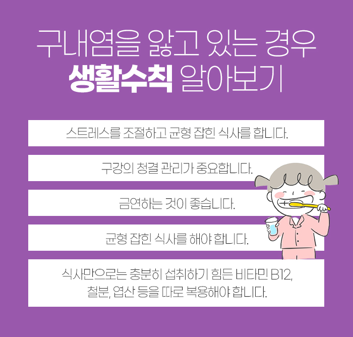 그리고 구내염을 앓고 있다면 다음과 같은 생활 수칙을 지켜주시는 게 좋은데요.