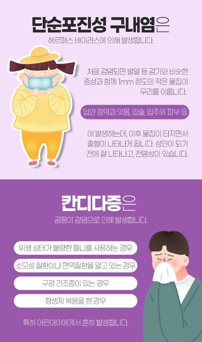 감염성 구내염의 경우 세균 감염, 바이러스 감염이 원인이 되는 단순포진에 의해, 구강 캔디다증 등을 말합니다. 또 비감염성 구내염은 자가면역 재발성 아프타성 구내궤양, 편평태선, 유천포창, 천포창 등을 말합니다.