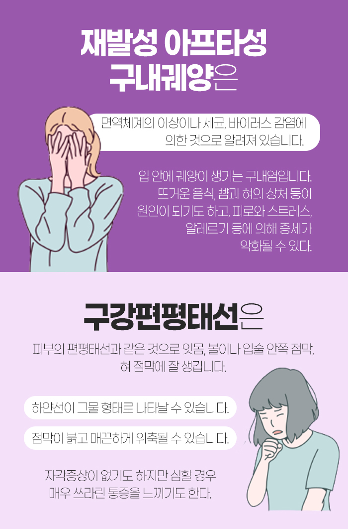 그리고 재발성 아프타성 구내궤양은 면역체계의 이상이 발생하거나 세균, 바이러스 감염에 의해 나타나는 것으로 알려져 있는데요. 입안에 궤양이 생기는 구내염인데 뜨거운 음식을 섭취하거나 뺨과 혀의 상처 등이 원인이 되어 나타나기도 한답니다. 또 피로와 스트레스, 알레르기 등에 의해 증상이 악화되기도 합니다.