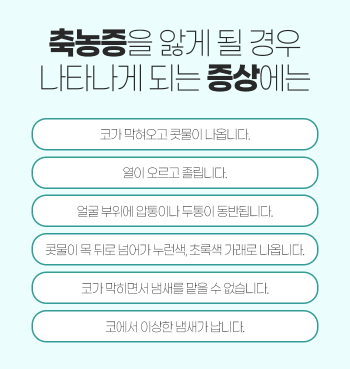 - 콧물이 목 뒤로 넘어가면서 노란색, 초록색 가래로 나옵니다.