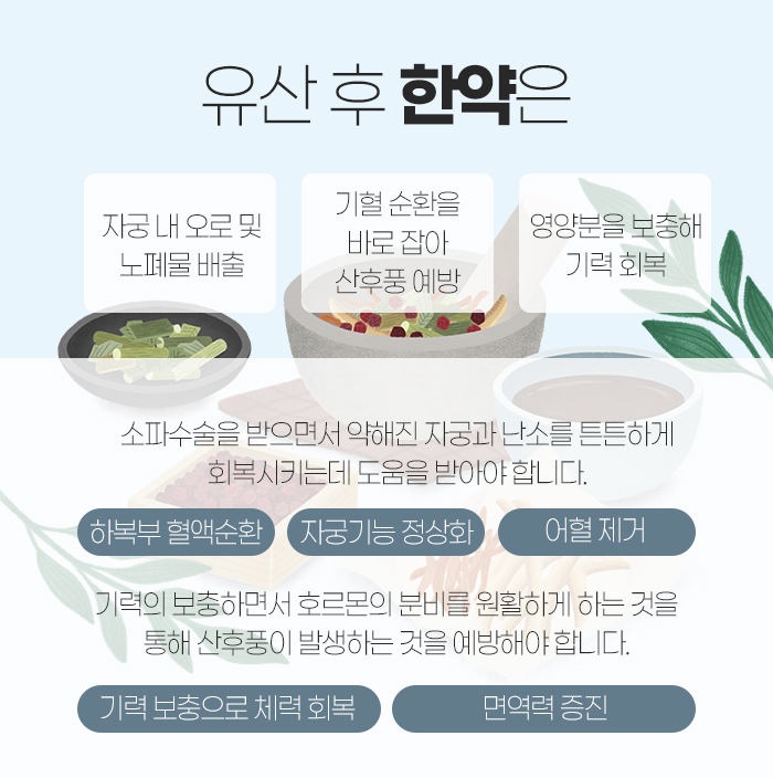 유산을 하는 과정에서 자궁과 난소가 약해지는 만큼 이를 튼튼하게 회복시키는 데도 도움받도록 해야 합니다. 그래서 하복부 혈액순환과 자궁 기능 정상화, 어혈 제거를 돕는답니다. 또 기력을 보충하면서 호르몬의 분비를 원활하게 하는 것을 통해 산후풍이 나타나는 것을 예방하는데 도움을 받아야 하는데요. 그래서 기력 보충으로 체력을 회복하고 면역력을 증진시키는 데 도움을 준답니다.