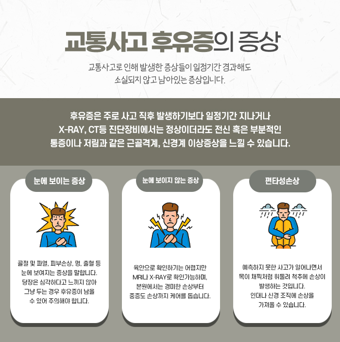 예기치 못한 순간에 찾아오는 교통사고는 우리 몸과 마음에 커다란 충격을 남기기 마련이며 사고의 크고 작음을 떠나서 몸이 보내는 작은 신호들을 면밀히 살펴야 하는 시기이기도 합니다. 교통사고 후유증이라는 것은 사고가 발생한 직후에는 별다른 이상이 느껴지지 않다가 시간이 흐르면서 서서히 나타나는 여러 가지 불편한 증상들을 통칭하는 말입니다. 짧게는 며칠에서 길게는 몇 주가 지난 뒤에야 나타나기도 하는데 이는 사고 당시 우리 몸이 급격한 충격으로부터 스스로를 보호하기 위해 잔뜩 긴장해 있다가 시간이 지나 긴장이 풀리면서 그동안 가려져 있던 통증들이 겉으로 드러나는 과정이라고 볼 수 있다고 원주일요일한의원에서는 말합니다.