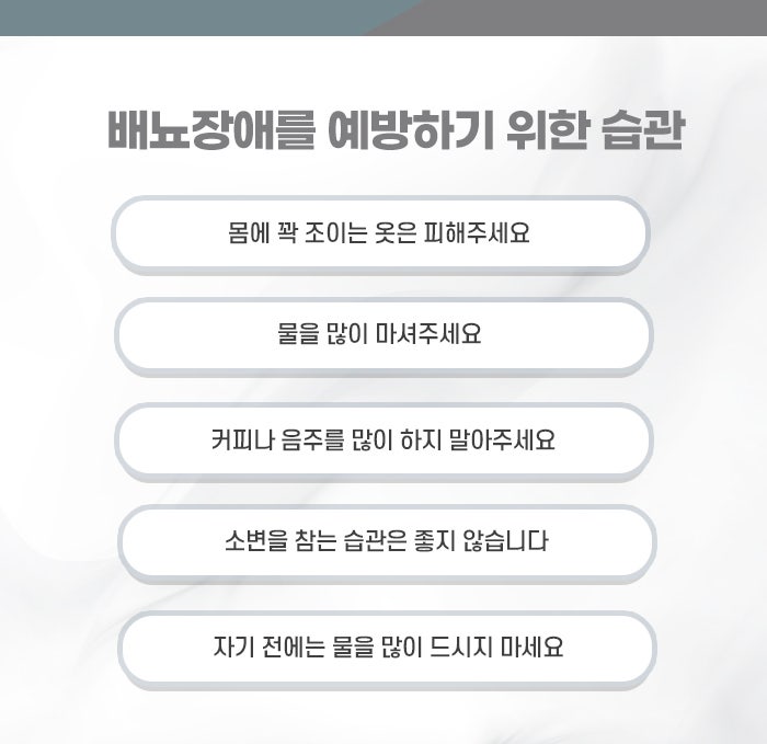 배뇨를 자주 참지 않도록 하고, 배뇨 욕구가 느껴지면 가능한 한 빨리 화장실에 가는 것이 중요합니다. 또한, 배뇨 후에는 배뇨를 완전히 마친 후 화장실을 나가야 합니다. 스트레스가 배뇨장애에 큰 영향을 미치므로, 스트레스를 관리하는 것이 중요합니다. 명상, 요가, 심호흡 운동 등을 통해 스트레스를 개선하고 정신적 안정을 찾는 것이 좋습니다.