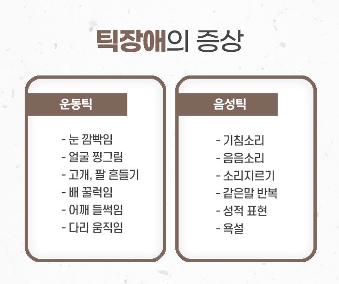 뇌의 신경전달물질인 도파민, 세로토닌 등의 불균형이 틱 발생과 관련이 있다는 연구 결과가 있습니다. 그리고 극심한 스트레스, 불안, 긴장 상황은 틱을 악화시킬 수 있습니다.