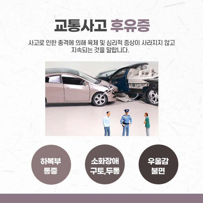 교통사고는 사고 당시의 직접적인 외상 외에도, 시간이 지나면서 다양한 신체적·정신적 후유증을 동반할 수 있는 복합적 사건입니다. 겉으로 큰 외상이 없어 보이더라도 내부 조직의 손상이나 긴장, 기능 저하 등이 장기적인 통증 및 기능 장애로 이어질 수 있기 때문에 사고 이후의 관리가 무엇보다 중요하다고 무실동교통사고한의원에서는 설명합니다. 교통사고 후유증이란 사고 직후에는 명확히 드러나지 않지만, 시간이 지나면서 나타나는 신체적 또는 정신적 이상 증상을 의미합니다. 일반적으로 사고 후 수일 내에 나타나기도 하지만, 경우에 따라 수주 또는 수개월이 지난 뒤 발생하는 경우도 있습니다. 이러한 후유증은 단순한 근육통에서부터 신경계 이상, 내장기 문제, 정신적인 불안 증상까지 매우 다양하게 나타날 수 있습니다.