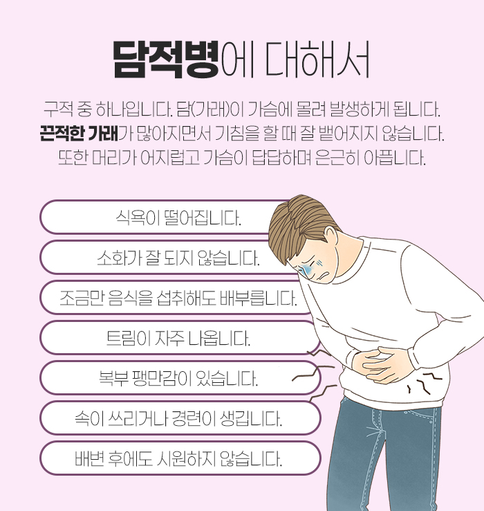 그런 만큼 담적병에 대해 살펴보자면 우선 담적병은 구적 중 하나입니다. 구적에는 음식이 잘 소화되지 않고 오랫동안 정체되면서 발생하는 식적과 술을 지나치게 많이 마셔서 발생하는 주적, 물이나 음료를 지나치게 많이 마셔서 발생한 수적, 어혈로 인해 발생한 혈적 등이 있습니다. 그리고 담적에서 '담'은 가래를 뜻하는데요. 이렇게 담적병을 앓게 되면 다음과 같은 증상이 나타나게 됟납니다.