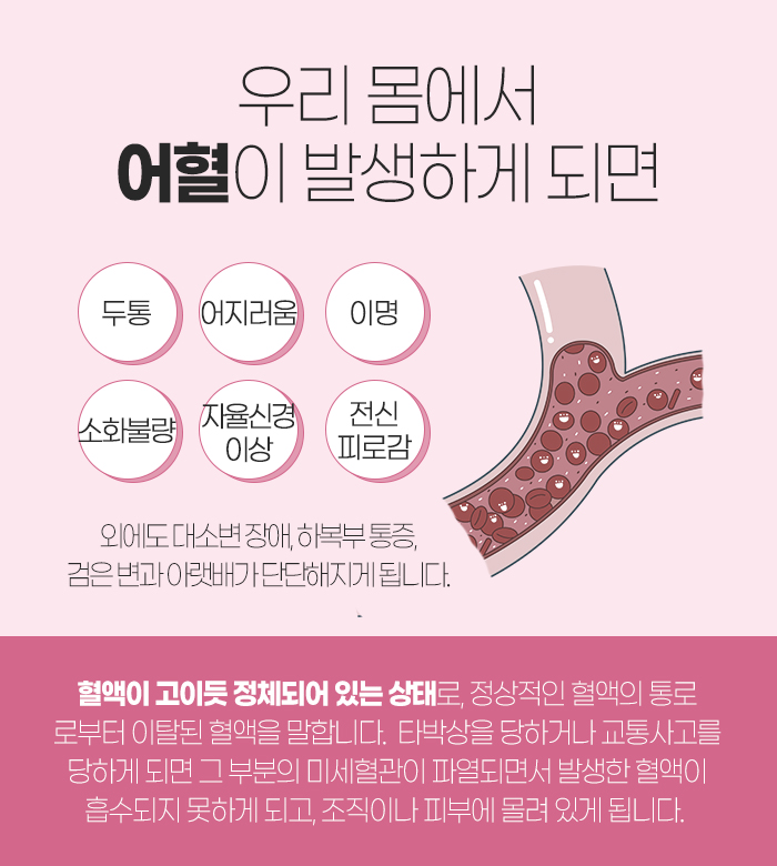 그리고 몸에 어혈도 발생하게 되는데요. 어혈이란 혈액이 고인 것처럼 정체되어 있는 상태랍니다. 정상적인 혈액의 통로로부터 이탈된 것으로, 미세혈관이 파열되면서 발생한 혈액이 흡수되지 못하게 되고 조직이나 피부에 몰려 있게 된답니다. 그래서 두통과 어지럼증, 이명, 소화불량, 자율신경 이상, 전신 피로감 등의 증상이 나타나게 되는데요.