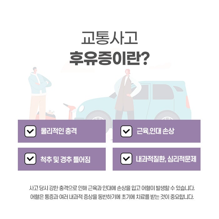 또한, 교통사고 후유증은 단순히 육체적 문제를 넘어, 심리적 회복까지 포함한 전인적 치료가 필요합니다. 몸과 마음이 모두 회복되어야만 진정한 의미의 일상 복귀가 가능한 것입니다. 이 과정은 단기간에 끝나는 일이 아니며, 꾸준한 치료와 관심, 생활 습관 개선, 정서적 지지가 함께 이루어져야 합니다. 더불어 사고 이후 일어날 수 있는 모든 상황에 대해 정보를 갖추시기 바랍니다. 교통사고는 누구에게나 일어날 수 있고, 사고의 여파는 예상보다 클 수 있습니다. 중요한 것은 그 이후 어떻게 대응하고 관리하느냐입니다. 자신을 위한 적절한 치료와 꾸준한 관심, 그리고 치유를 향한 의지가 있다면, 교통사고 후유증도 충분히 치료할 수 있습니다. 몸이 보내는 작은 신호에도 귀 기울이고, 스스로의 회복을 소중히 여긴다면, 결국 이전보다 더 건강하고 단단한 삶으로 나아갈 수 있을 것입니다.