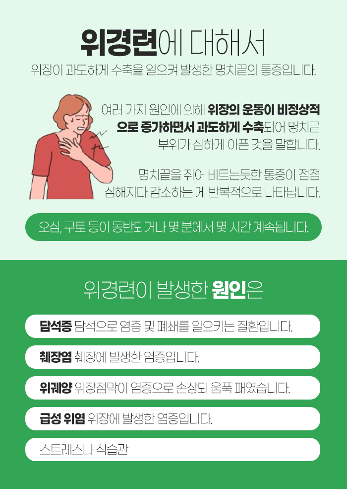 위경련은 담석증이나 췌장염, 위궤양, 급성 위염에 의해 발생하게 됩니다. 또 스트레스를 많이 받거나 습관에 문제가 있어서, 다른 질환에 의해서 발생하게 되는데요.