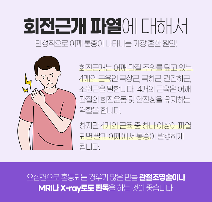 덧붙여 회전근개 파열로 나타나는 증상은 오십견하고 혼동되기 쉽습니다. 그래서 자신이 앓고 있는 질환이 회전근개 파열인지 오십견인지 확신하지 못하시는 분들이 많은데요. 이런 경우 관절조영술이나 MRI, X-ray로 판독할 수 있습니다.