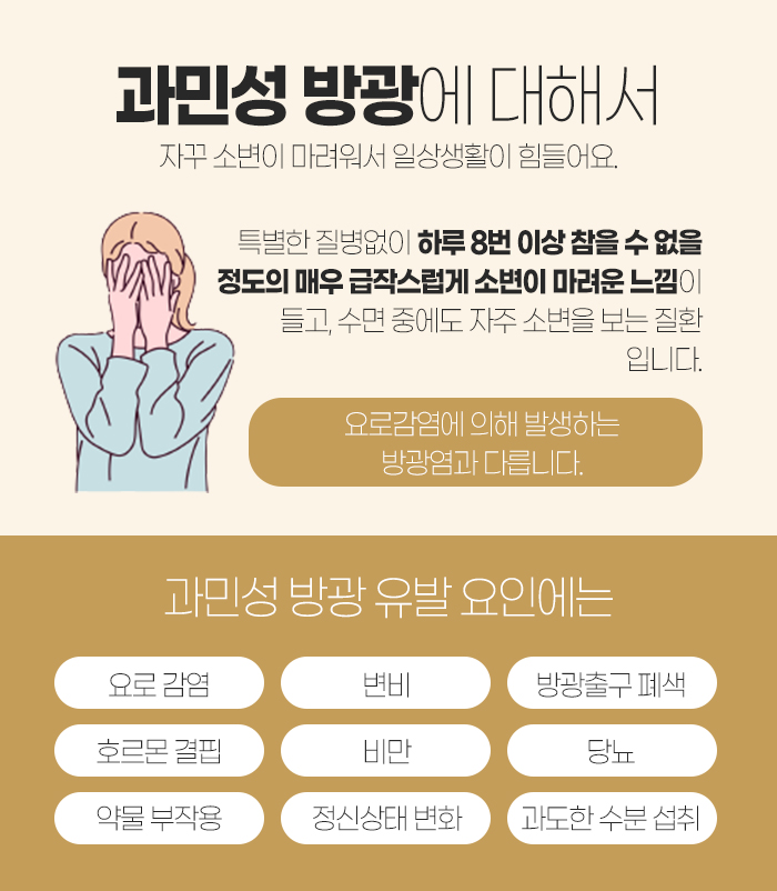 그리고 과민성 방광으로 인해 빈뇨가 발생하게 되기도 합니다. 과민성 방광은 하루에 8회 이상 참을 수 없는 정도의 정도로 갑자기 소변이 마려운 느낌이 들게 되는데요. 수면 중에도 자주 소변을 보게 된답니다. 요로감염에 의해 발생하게 되는 방광염과는 다른데요. 이러한 과민성 방광은 발생하게 되는 원인이 무척 다양하답니다.