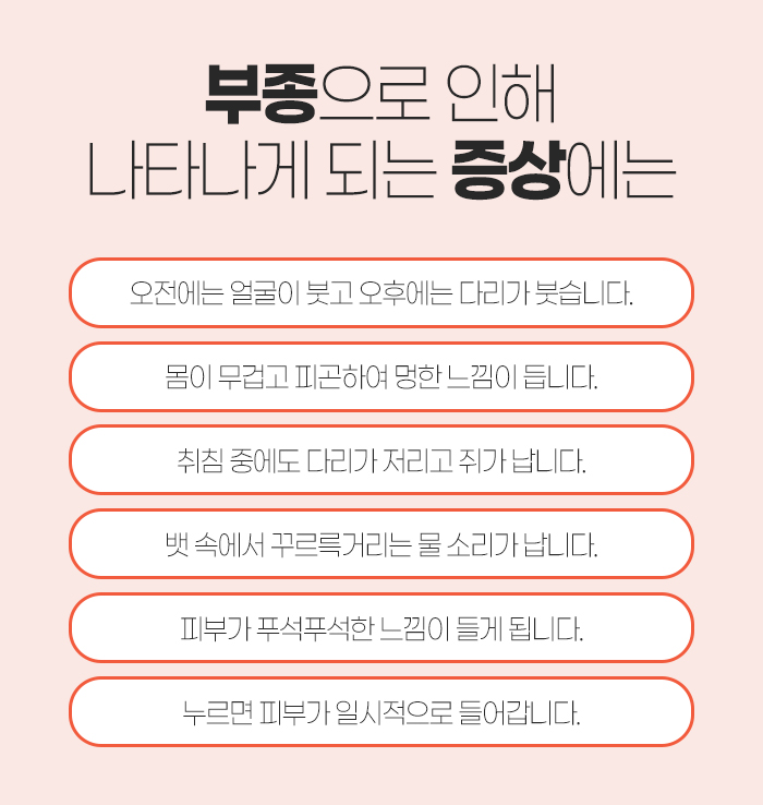 우선 부종은 체액이 신체 조직의 간질에 축적되어 피부가 부어오르게 되는 것을 말합니다. 이렇게 부종이 발생하게 되면 다음과 같은 증상이 나타나게 되는데요.