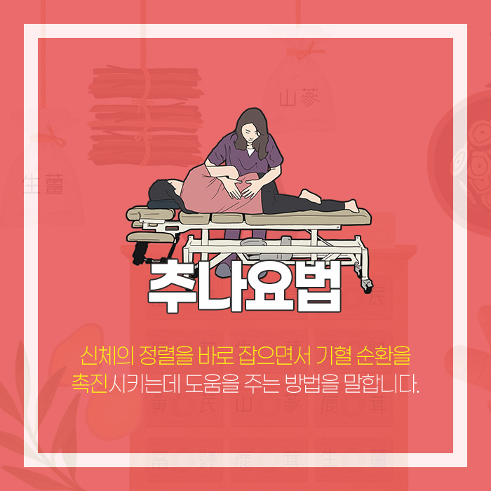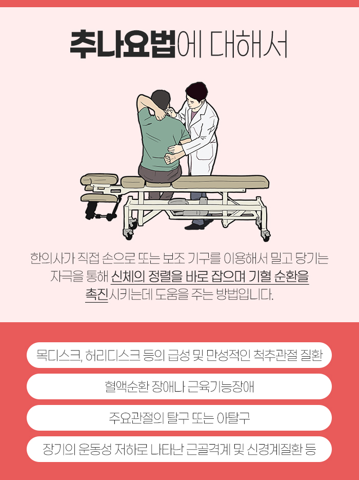 이러한 추나요법은 한의사가 직접 손이나 보조기구를 통해 밀고 당기는 자극으로 신체의 정렬을 바로 잡으며 기혈순환을 촉진시키는데 도움을 주는 방법을 말합니다. 그래서 목디스크나 허리디스크와 같은 급성 및 만성적인 척추 관절 질환을 앓고 있을 때 도움을 받을 수 있고