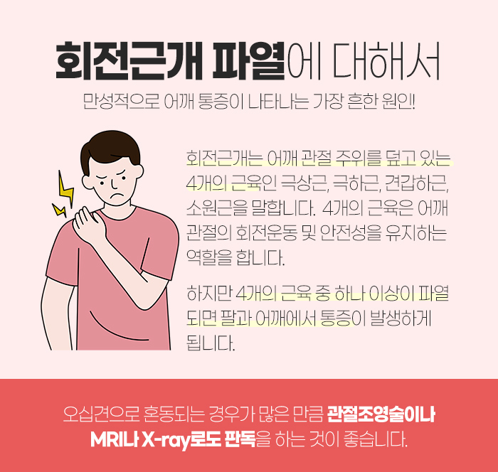 여기서 회전근개 파열에 대해 말해보자면 만성적으로 어깨에서 통증이 나타나게 되는 질환이랍니다. 어깨 주위를 덮고 있는 4개의 근육인 극상근, 극하근, 견갑하근, 소원근을 회전근개라고 하는데 이 4개의 근육은 어깨 관절의 회전운동 및 안전성을 유지하는 역할을 한답니다. 그런데 4개의 근육 중 하나 이상이 파열되면 팔과 어깨에서 통증이 나타나게 되는데요.