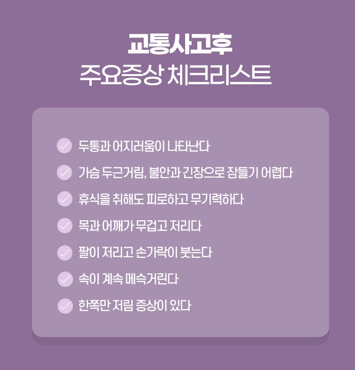 교통사고 후유증은 그 증상과 정도가 사람마다 다를 수 있습니다. 사고 직후에는 아무런 증상이 없더라도, 시간이 지나면서 통증이나 불편함이 나타날 수 있기 때문에, 사고 후에는 정기적인 건강 체크를 받는 것이 좋습니다. 교통사고 후유증은 시간이 지나면서 서서히 나타날 수 있기 때문에, 사고 후 즉각적인 치료뿐만 아니라 지속적인 관리가 필요합니다. 이를 통해 신체의 회복을 촉진하고, 후유증을 최소화할 수 있습니다.