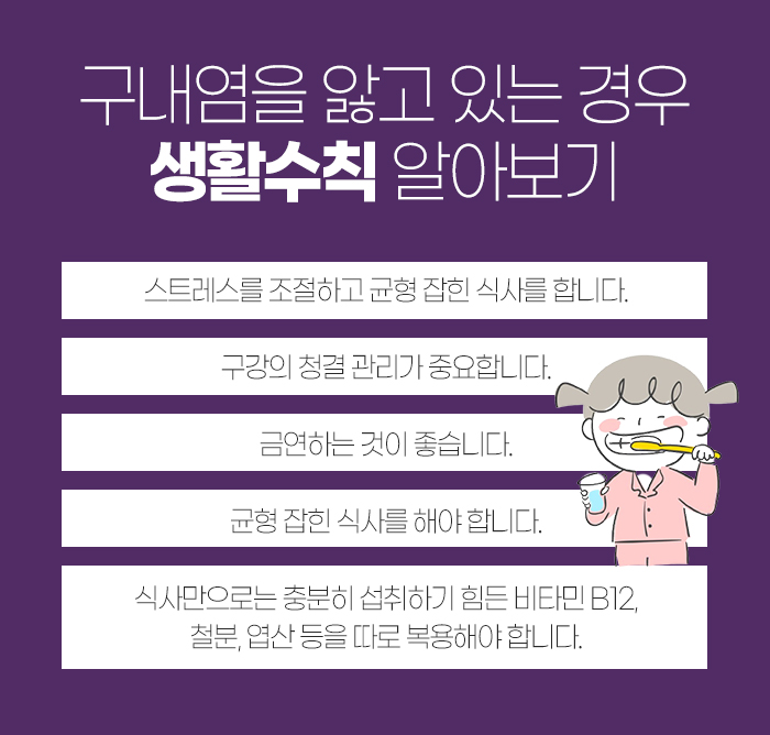 그래서 지켜야 하는 생활 수칙에 대해 말해보자면 스트레스를 조절하고 균형 잡힌 식사를 해야 합니다. 또 구강의 청결관리가 중요하며, 금연을 하도록 해야 하는데요. 식사를 할 때 비타민 B12와 철분, 엽산 등을 충분히 섭취하기 힘들기 때문에 따로 복용하시는 게 좋답니다.