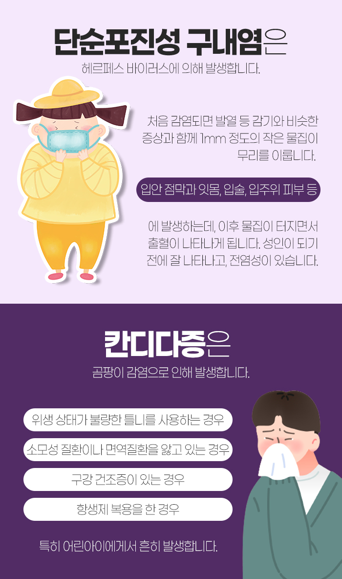 감염성 원인에 대해 살펴보자면 세균 및 바이러스 감염으로 인한 단순포진과 구강칸디다증 등이 있습니다. 또 비감염성은 자가면역이나 재발성 아프타성 구내궤양, 편평태성, 유천포창, 천포창 등이 있습니다.