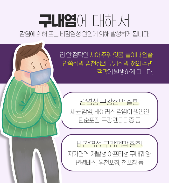 그리고 구내염에 대해 설명하자면 감염에 의해 또는 비감염성 원인에 의해 발생하게 되는데요. 입안 점막인 치아 주위 잇몸, 볼이나 입술의 안쪽 점막, 입 천장의 구개점막, 혀와 주변 점막에 발생하게 된답니다.