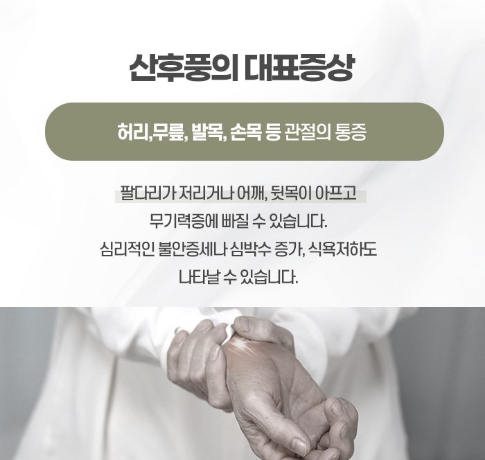 산후풍의 대표적인 증상은 관절통과 근육통입니다. 특히 무릎, 허리, 손목, 발목, 어깨 등의 관절 부위에서 지속적인 통증이나 시림, 저림, 뻣뻣함 등이 느껴지며, 날씨가 흐리거나 비가 오는 날, 또는 피로가 쌓였을 때 증상이 더 심해지는 경향이 있습니다. 이 외에도 손발이 시리고 저리는 증상, 허리와 골반의 불안정감, 전신의 피로감, 두통, 어지럼증, 가슴 두근거림, 땀이 비정상적으로 나는 증상, 소화기 이상, 수면 장애, 정서적 불안정 등 매우 다양한 증상이 동반될 수 있습니다. 이러한 증상은 출산 직후부터 나타날 수도 있지만, 수 주 또는 수개월이 지난 후에 서서히 나타나기도 하며, 시간이 지나도 쉽게 낫지 않고 만성화되기 쉬운 특징이 있어 조속한 원주주말진료한의원산후풍치료가 필요합니다.
