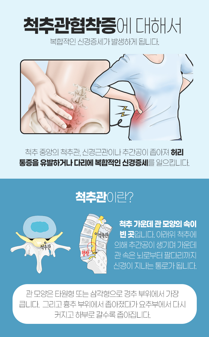 그리고 이러한 척추관 협착증에 대해 말해보자면 척추 중앙의 척추관, 신경근관이나 추간공이 좁아지게 되면서 허리에 통증을 유발하게 되거나 다리에 복합적인 신경 증세를 일으키게 되기 때문입니다.