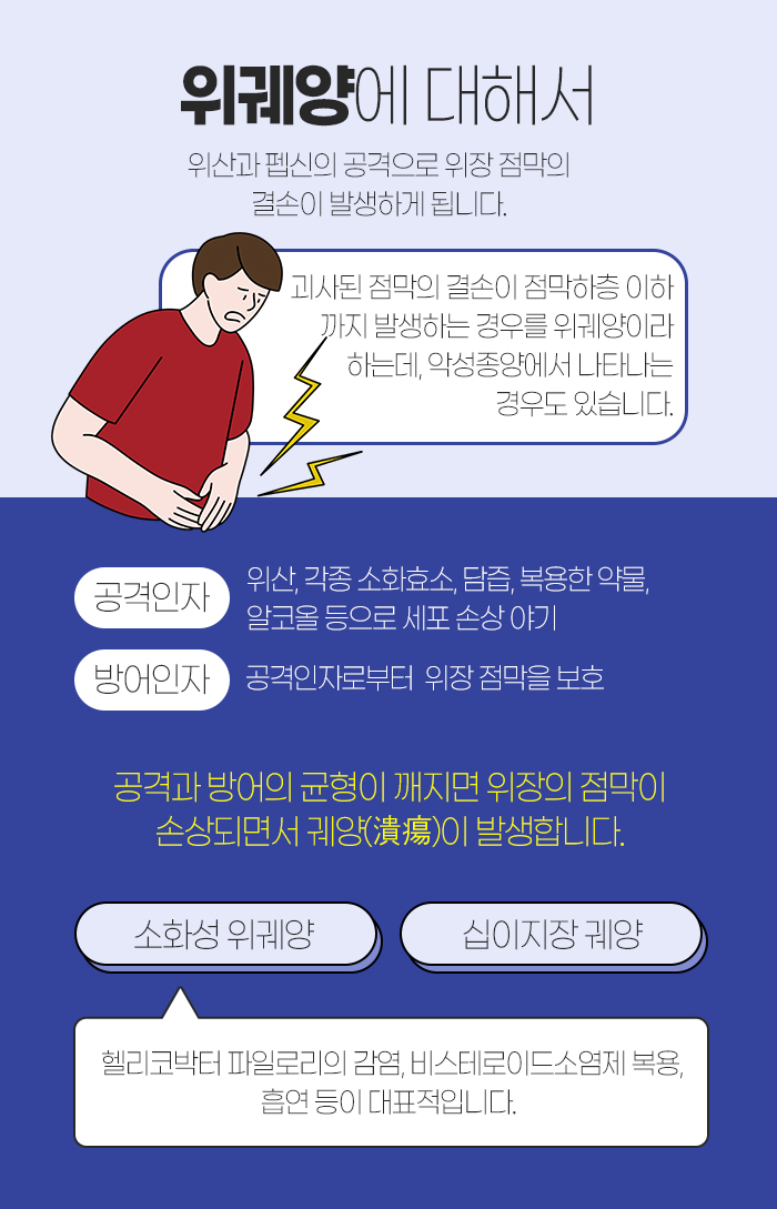 좀 더 자세히 살펴보자면 공격 인자와 방어 인자가 있습니다. 공격 인자는 위장점막을 공격하는 인자를 말하는데 위산과 각종 소화효소, 담즙, 약물, 알코올이 해당됩니다. 그리고 공격 인자로부터 위장점막을 보호하는 것을 방어 인자라 하는데요. 이러한 공격과 방어의 균형이 깨지게 되면 위장점막이 손상되면서 위궤양이 나타나게 됩니다.