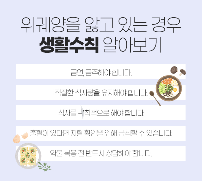 특히 음주와 흡연이 건강에 도움이 되지 않고 악영향을 준다는 사실은 잘 알고 계실 텐데요. 이는 당연히 위궤양에도 좋지 못하답니다. 그리고 식사를 규칙적으로 적절하게 하는 것은 무척 중요한 문제인데요. 하지만 요즘에는 바쁘다는 이유로 또는 귀찮다는 이유로 규칙적으로 식사를 하지 않거나 끼니를 거르거나 한 번에 몰아서 과식하는 등의 문제로 인해 위 건강에 악영향을 주게 되는 경우가 많습니다.
