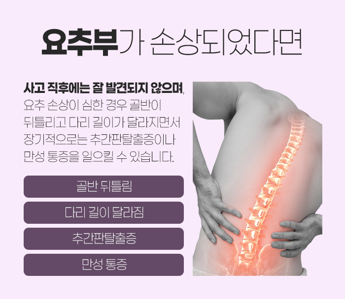 그리고 갑자기 당한 교통사고 때문에 후유증 증상으로 허리에서 통증이 발생하여 무실동야간진료한의원을 찾게 되기도 하는데요. 참고로 교통사고로 인해 요추부가 손상되는 경우는 많습니다. 그리고 사고를 당하고 나서 통증이 바로 나타나는 경우도 있지만 뒤늦게 나타나게 되는 경우가 적지 않은데요.