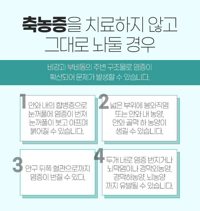 그리고 이러한 축농증을 치료하지 않고 그대로 놔둘 경우에는 비강과 분비물의 주변 구조물 때문에 염증이 확산되면서 문제가 발생할 수 있는데요. 안와 내의 합병증 때문에 눈꺼풀에 염증이 번지면서 눈꺼풀이 붓고 아프며 불거질 수 있답니다. 또 넓은 부위의 봉와직염이나 안와 내 농양, 안와 골막하 농양이 생길 수 있습니다. 그리고 안구 뒤쪽 혈관으로까지 염증이 번질 수 있고, 두개 내로 염증이 번지거나 뇌막염, 경막외농양, 경막하농양, 뇌농양까지 유발할 수 있답니다.