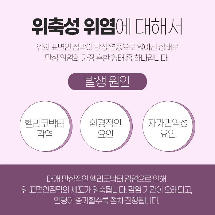 다음으로 위축성 위염은 위의 표면인 점막이 만성 염증 때문에 얇아진 상태를 말합니다. 만성 위염의 가장 흔한 형태 중 하나인데요. 이렇게 위축성 위염이 발생하게 되는 원인에는 헬리코박터 감염과 환경적인 요인, 자가면역성 요인이 있습니다.