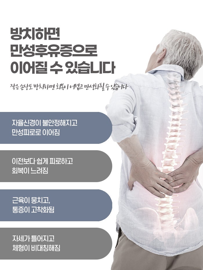 특히 사고 당시의 충격이 크거나 생명의 위협을 강하게 느낀 경우, 또는 어린 자녀가 함께 있었거나 가족이 사고로 다친 경우 등 정서적 충격이 컸던 상황일수록 심리적 후유증의 발생 가능성이 높아집니다. 사고 후 차량 운전을 두려워하거나, 교통수단을 이용하지 못하거나, 사고 장면이 반복적으로 떠오르며 수면장애나 과민반응이 나타나는 등, 삶의 전반적인 기능 저하로 이어질 수 있습니다. 이 같은 정신적 후유증은 시간이 지나도 저절로 사라지지 않으며, 오히려 무기력과 회피 행동이 쌓이면서 점점 더 심화될 수 있기 때문에, 조기 개입과 적절한 심리적 지원이 반드시 필요합니다. 교통사고 후유증을 방치할 경우 문제가 단순히 지속되는 수준을 넘어 점점 더 복잡하고 만성화된 양상으로 발전할 수 있습니다. 초기의 근육통이나 경미한 두통도 장기적으로 치료하지 않으면 만성 근골격계 질환으로 발전하여 일상적인 움직임조차 제한받을 수 있다고 원주입원실한의원에서는 말합니다. 특히 목이나 허리의 디스크 손상, 인대 약화, 관절의 불균형 등이 교정되지 않으면 지속적인 통증과 함께 자세 불균형, 체형 변화, 운동성 저하가 나타날 수 있으며, 이는 결과적으로 척추 질환이나 관절염의 원인이 되기도 합니다.
