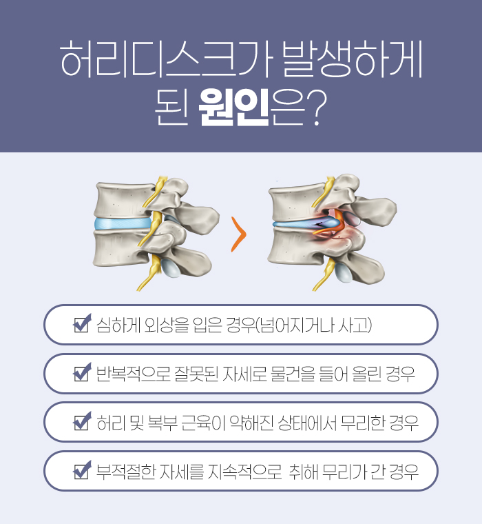 그리고 허리디스크가 나타나는 이유는 다양합니다. 넘어지거나 사고를 당하게 되는 등 심하게 외상을 입어서, 반복적으로 잘못된 자세로 물건을 들어 올려서, 허리와 복부 근육이 약해진 상태인데 무리를 해서, 부적절한 자세를 지속적으로 취해 무리를 하게 되어서입니다.