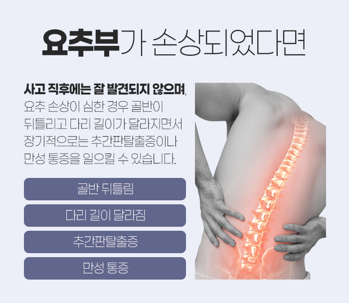 그리고 교통사고로 인해 허리디스크가 발생한 환자분들의 경우 대부분 사고 직후 잘 발견되지 않는 경우가 많은데요. 이는 사고로 충격을 받게 되었을 때 몸이 충격으로부터 보호하기 위해 경직되기 때문입니다. 그리고 경직이 풀리면서 뒤늦게 통증이 나타나게 되는데요. 이러한 요추부 손상이 심할 경우 골반이 뒤틀리거나 다리 길이가 달라지면서 허리디스크 외에도 만성적으로 허리에서 통증이 나타날 수 있습니다.