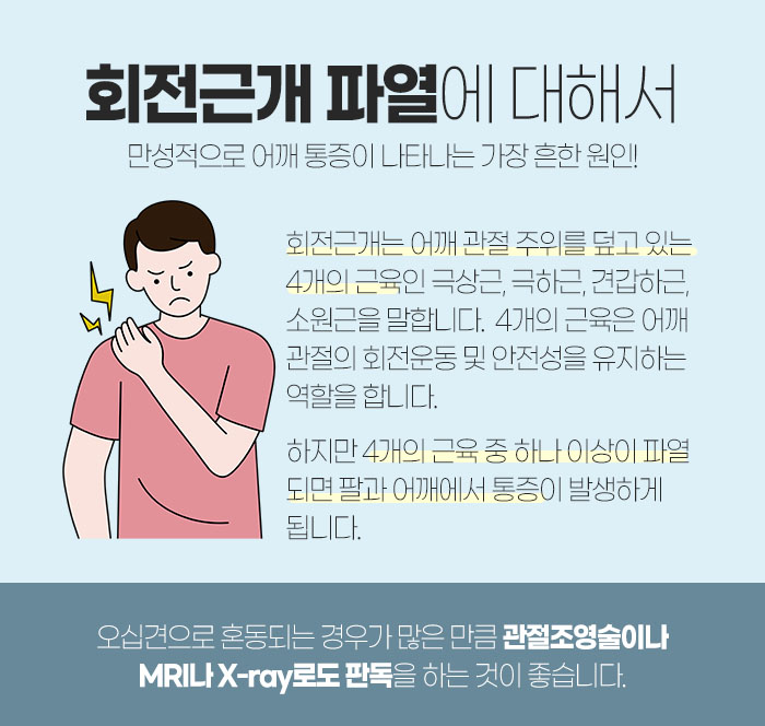 그러나 4개의 근육 중에서 하나 이상이 파열될 경우 팔과 어깨에서 통증이 나타나게 되는데요. 이렇게 회전근개 파열로 나타나는 증상이 오십견과도 비슷해서 혼동하시는 경우가 많습니다. 그래서 자세히 알아보고자 하는 경우에는 관절조영술이나 MRI, X-ray로 판독을 하게 됩니다.