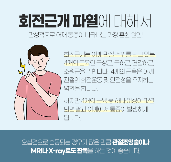 참고로 회전근개 파열은 어깨 관절 주위를 덮고 있는 4개의 근육인 극상근과 극하근, 견갑하근, 소원근 중 하나 이상이 파열된 것을 말하는데요. 어깨 관절의 회전운동 및 안정성을 유지하는 역할을 하는 만큼 파열될 경우 팔과 어깨에서 통증이 나타나게 된답니다.
