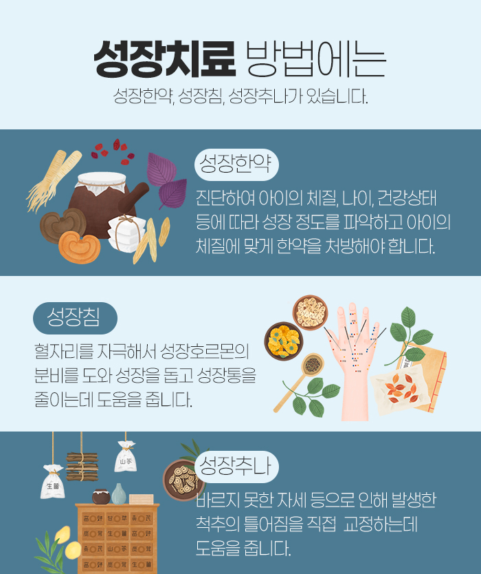 이 외에도 성장한약이나 성장침 등의 방법을 통해 도움을 받게 되는데요. 성장한약은 아이의 체질과 나이, 건강상태 등에 따라 성장 정도를 파악한 다음 처방을 하게 된답니다. 또 성장침은 혈자리르 자극해서 성장호르몬의 분비를 도와 성장을 도우며 성장통을 줄이는데 도움을 줍니다.